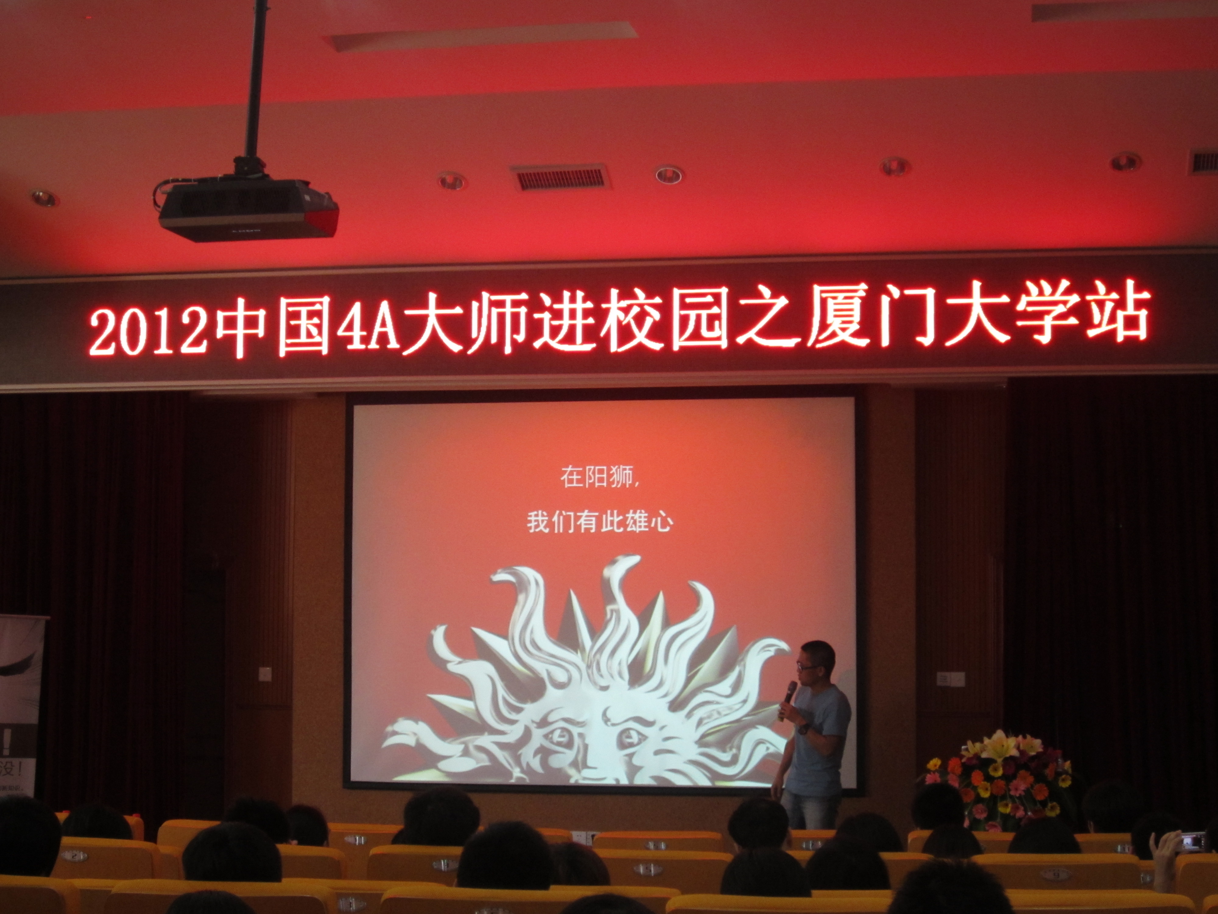 6月8日下午,一年一度的“4A大师进校园”来到厦门大学,在化学报告厅为同学们奉献了两场精彩的讲座。首先上场的嘉宾是来自阳狮广州的资深客户总监苏日良先生,他带来的是以“全球性的策略创意思考方法 lead and change”...