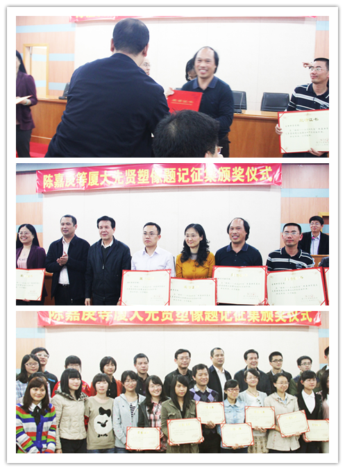 4月2日晚,“铭刻――永远的纪念”陈嘉庚等厦大先辈塑像题记征集活动颁奖仪式在颂恩楼220会议室举行。学院党委副书记林盛铨代表新闻传播学院领取优秀组织奖,我院2010级的本科生丁晨获得三等奖。为弘扬嘉庚精神,彰显以陈嘉庚先生为代表的厦大先辈爱国爱校、...